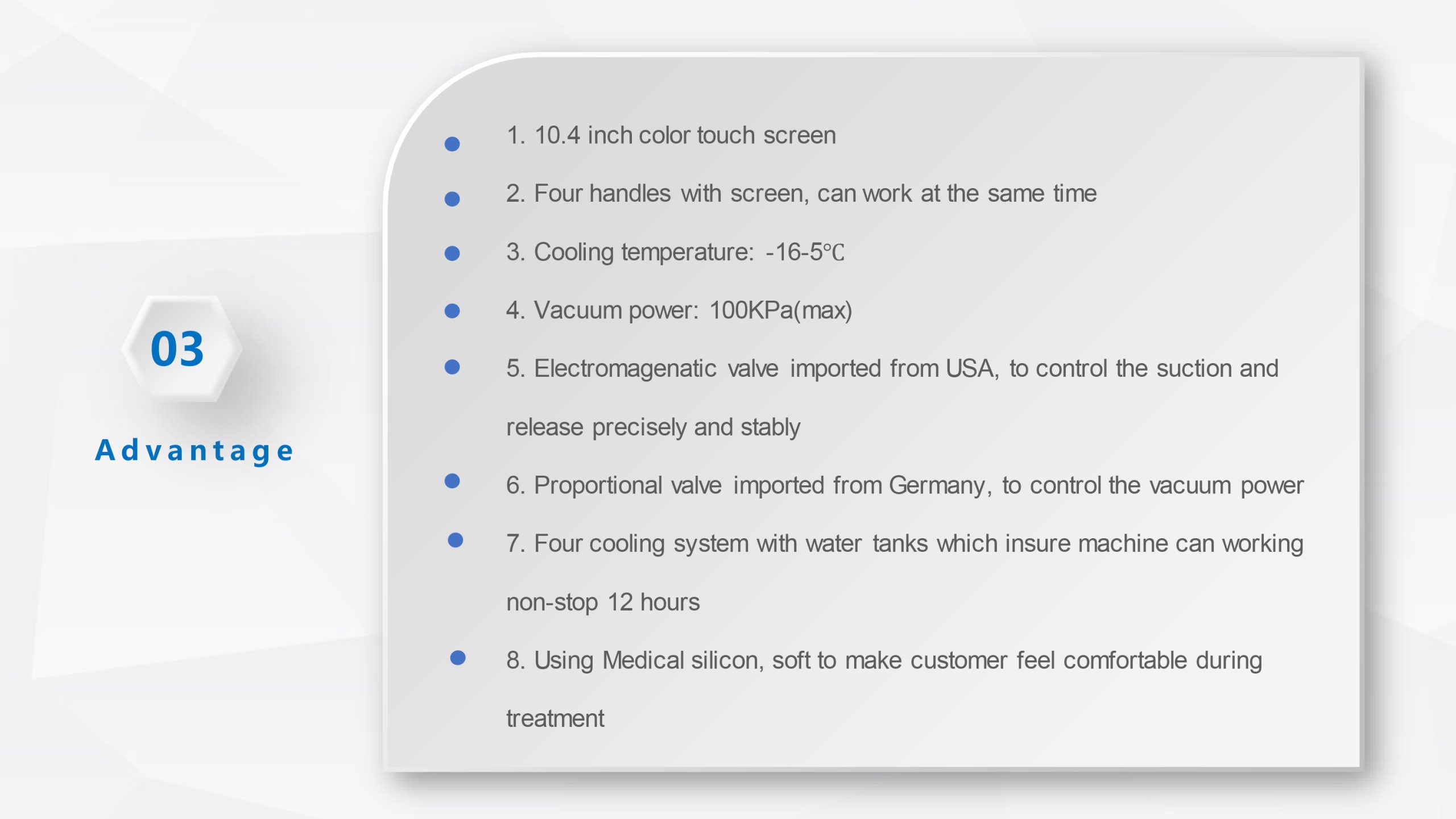 دستگاه Cryomax ترکیبی از فناوری پیشرفته و طراحی ایمن را ارائه میدهد که به کلینیکها امکان ارائه خدمات لاغری مؤثر و مقرونبهصرفه را میدهد.