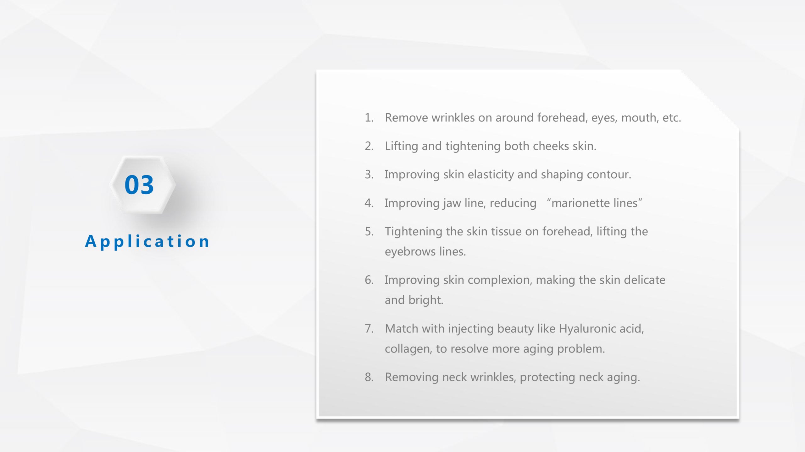 کاربردها لیفت صورت و گردن، غبغب، رفع چین‌وچروک، بهبود کیفیت پوست